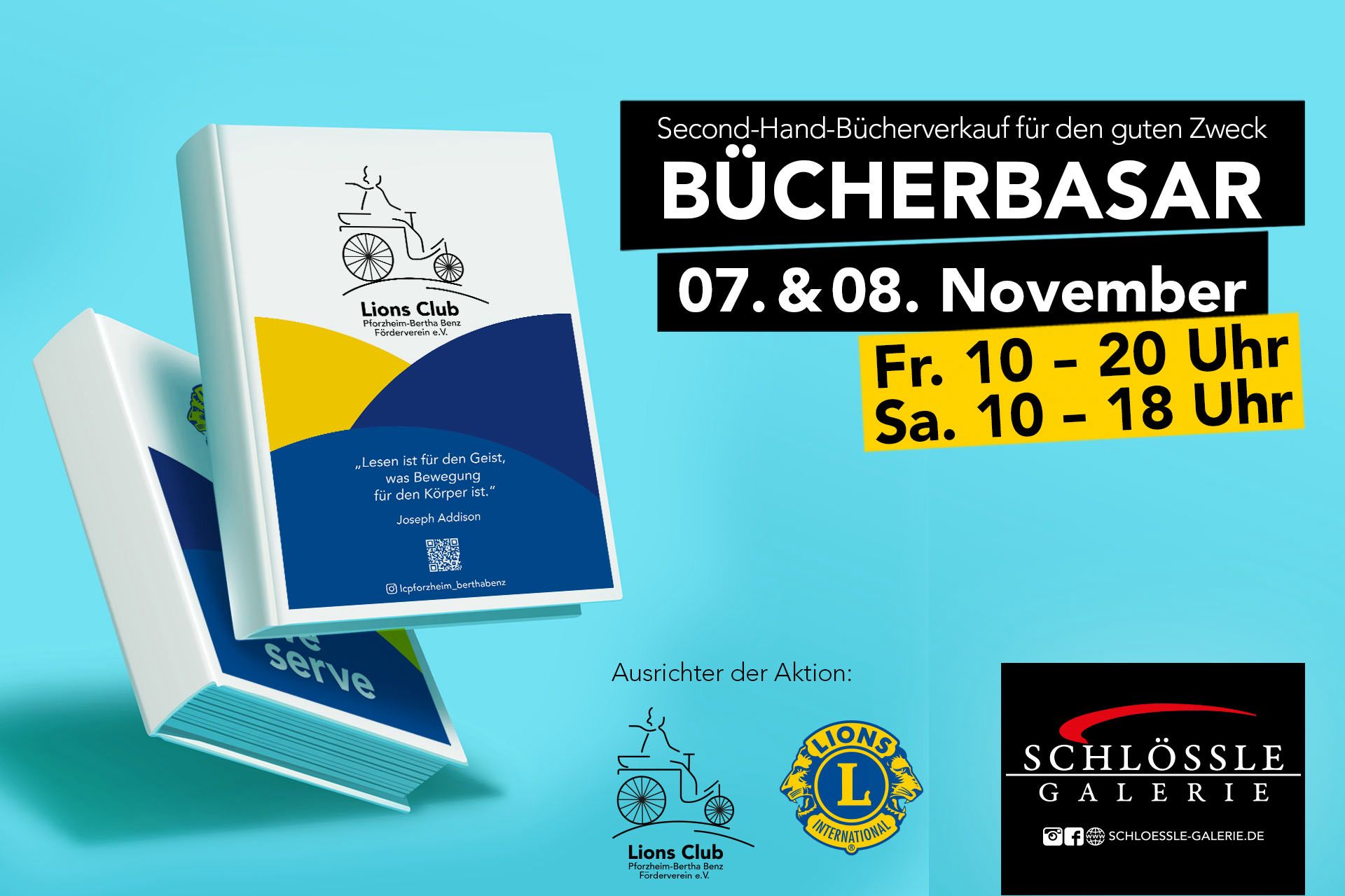 Am 7. und 8. November 2025 laden wir, der Lions Club Pforzheim-Bertha Benz Förderverein e.V., wieder herzlich zu unserem beliebten Bücherbasar in die Schlössle-Galerie Pforzheim ein. An diesen beiden Tagen verwandeln wir die Galerie in ein kleines Bücherparadies, in dem tausende Romane, Krimis, Kinder- und Sachbücher auf neue Besitzerinnen und Besitzer warten.